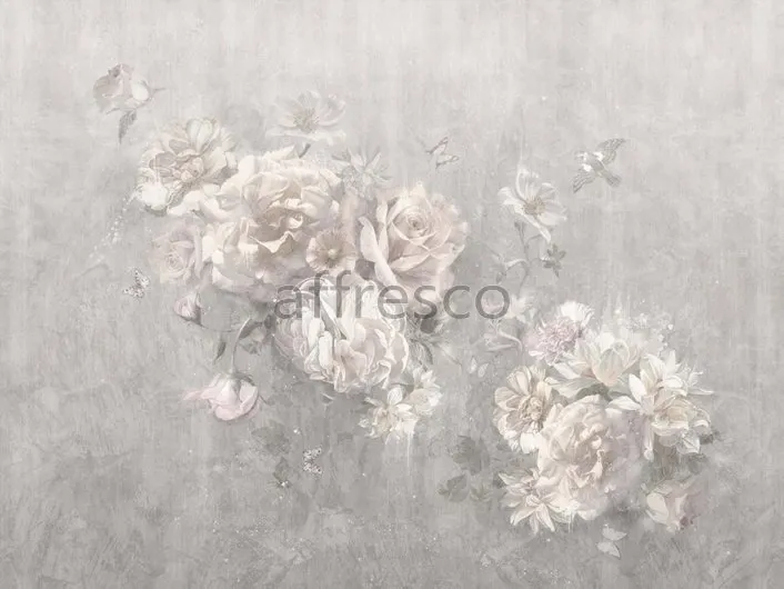 Фрески Affresco из коллекции New Art представляют собой рулонный декор, имитирующий классическую фреску. Дизайн включает в себя изображение цветов в серых и розовых оттенках, что делает его подходящим для гостиных и спален.