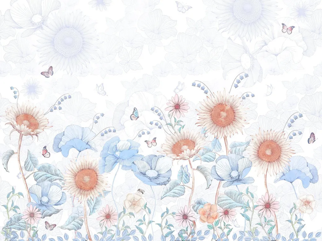 Фрески Affresco из коллекции "Сказки Affresco" предлагают уникальный подход к оформлению интерьера. Изображение цветов в белом и голубом цветах создает атмосферу спокойствия и гармонии в помещениях, таких как детская или спальня.