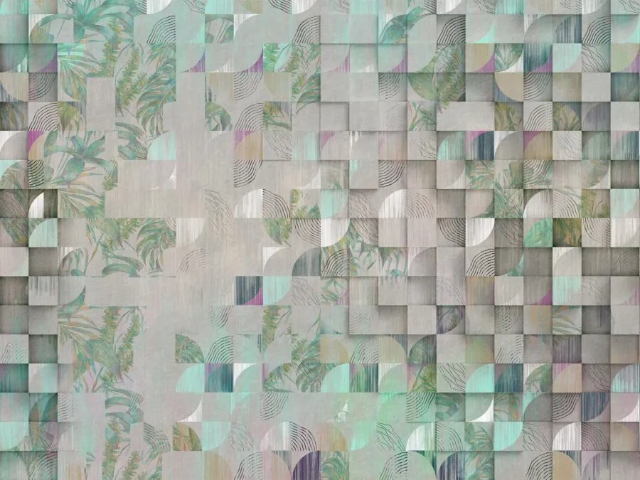Фрески Affresco из коллекции Trend Art представляют собой инновационное решение для декора интерьеров. Дизайн включает геометрический узор с квадратами в сером и зеленом цветах, что позволяет эффективно вписать их в современные стили оформления помещений.