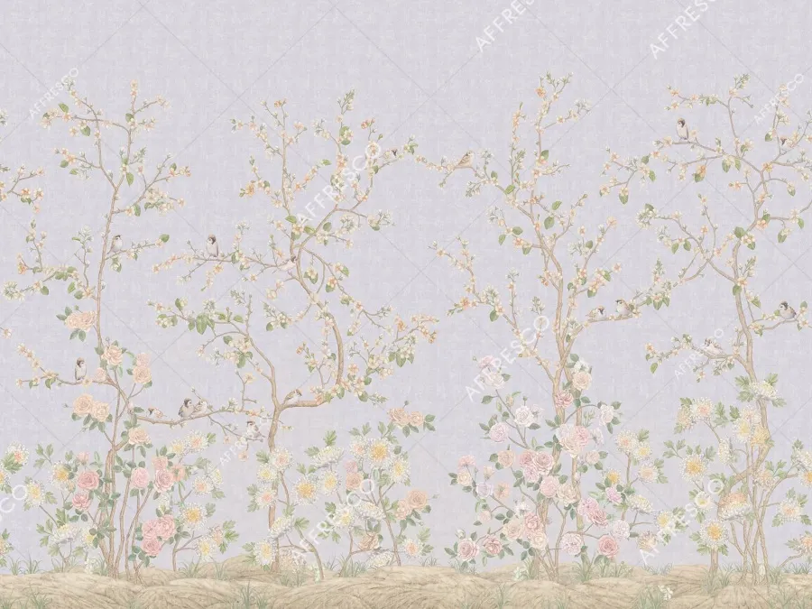 Фрески Affresco из коллекции Wallpaper part 2 представляют собой качественные фотообои с изображением птиц и цветов в стиле шинуазри. Эти фрески созданы для декорирования современных интерьеров, таких как гостиные и спальни, и подходят для акцентных стен.