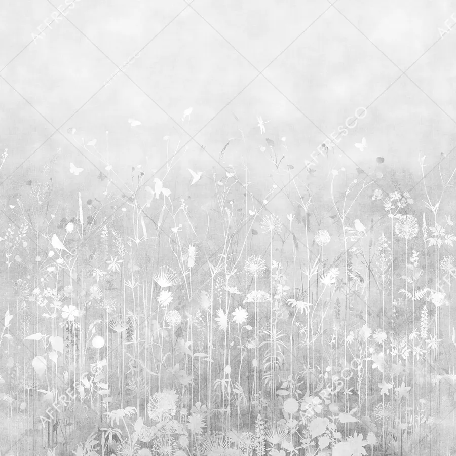 Фреска Affresco из коллекции Wallpaper part 2 оформлена в серых тонах с изображением растений, веток и листьев. Этот элемент декора подходит для различных помещений, таких как гостиная, кухня и спальня, благодаря универсальности своего дизайна.