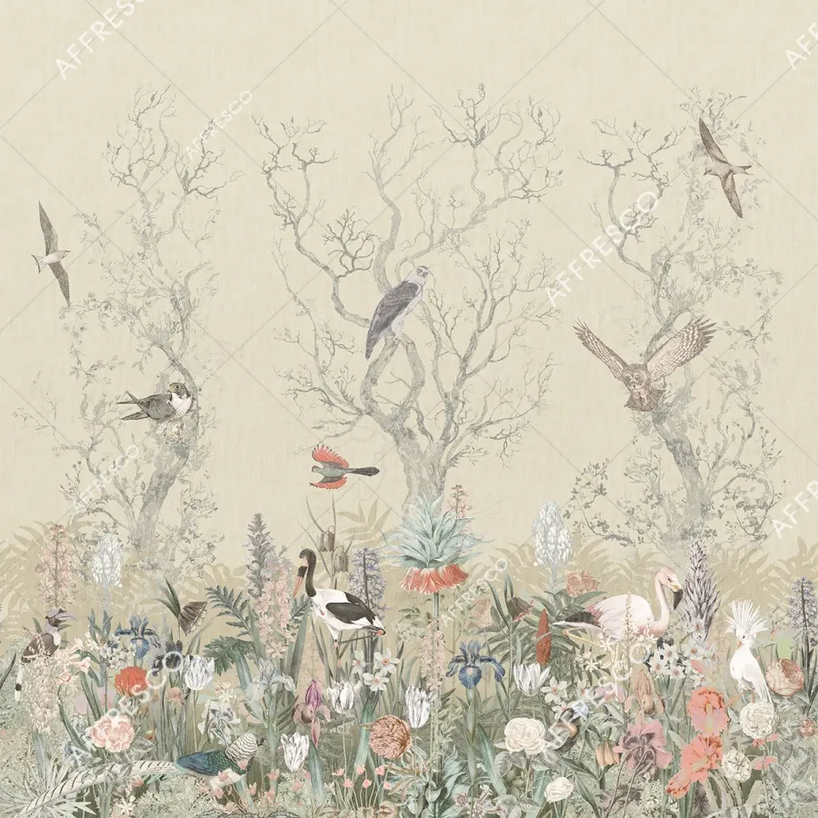 Фрески Affresco из коллекции Wallpaper part 2 представляют собой стильные фотообои с изображениями птиц и растений. Они созданы для декора стен в жилых и офисных помещениях, таких как гостиные и спальни. Спокойные бежевые оттенки придают помещению умиротворяющую атмосферу.
