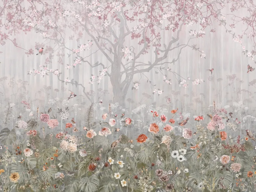 Фрески Affresco из коллекции Wallpaper part 2 представляют собой стильное решение для декорирования интерьеров. Они идеально подходят для детских и спальных комнат, создавая атмосферу уюта и комфорта. Данная фреска с изображением цветов и птиц выполнена в благоприятных оттенках серого и зеленого, что усиливает спокойствие в помещении.