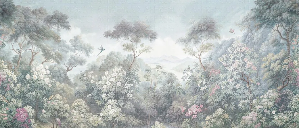 Фрески Affresco из коллекции Wallpaper part 3 Forest предлагают уникальное оформление интерьера. Этот продукт сочетает в себе разнообразные растительные мотивы и птиц, что делает его подходящим как для гостиной, так и для спальни.