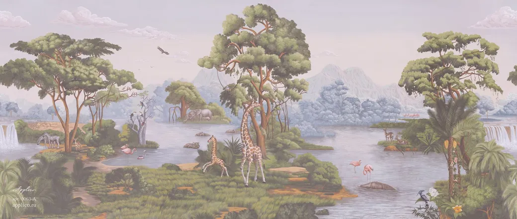 Фрески Applico из коллекции Five представляют собой фотообои с изображениями животных и растений. Эти эко обои подойдут для оформления стен в детской комнате, создавая успокаивающую атмосферу благодаря разнообразным оттенкам зеленого и голубого.