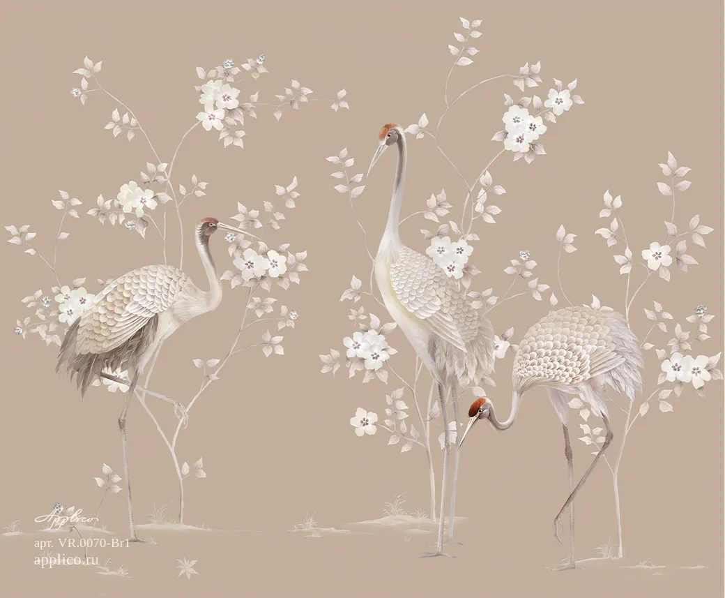 Фрески Applico из коллекции Five представляют собой декоративные панно с изображениями цветов и птиц в стиле шинуазри. Эти флизелиновые обои подходят для оформления стен в гостиных и спальнях, обеспечивая спокойную атмосферу с использованием бежевых и золотых оттенков.