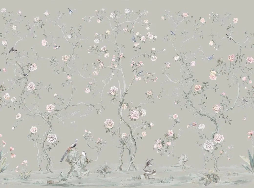 Фрески Applico из коллекции One предлагают стильный декор для гостиной и спальни. Вдохновленные шинуазри, они создают атмосферу оптимизма с изображением цветов и птиц. Серый цвет требует тщательного подбора оттенков для гармоничного сочетания с другими элементами интерьера.