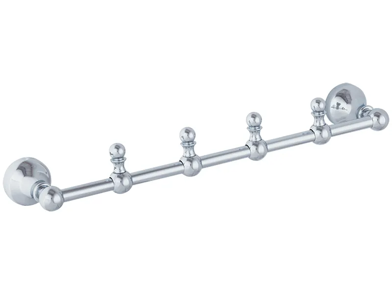 Перекладина с 4-мя крючками VR.GIL-6434.CR серии GIALETTA — очень многофункциональный аксессуар, который мы можете использовать не только для ванной комнаты, но и на кухне, и в корридоре, в кладовке. Общая длина составляет 40 см, 4 крючка классической формы расположены на достаточном удалении друг от друга, что позволит удобно разместить любые вещи и большие полотенца. Материал — латунь. Хромо-никелевое гальваническое покрытие обеспечивает устойчивость к царапинам и придает изделию зеркальный блеск.