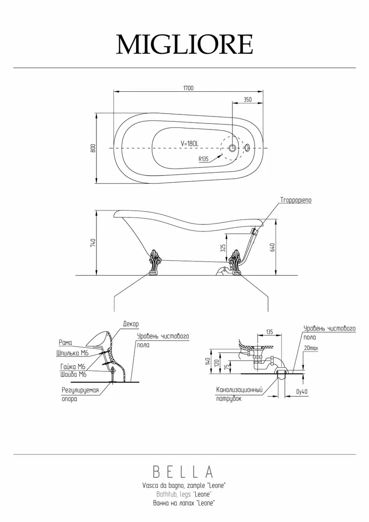 GIALETTA Ванна 170x81xH74 см. на лапах "LEONE" LUX, слив/перелив хром арт-25217