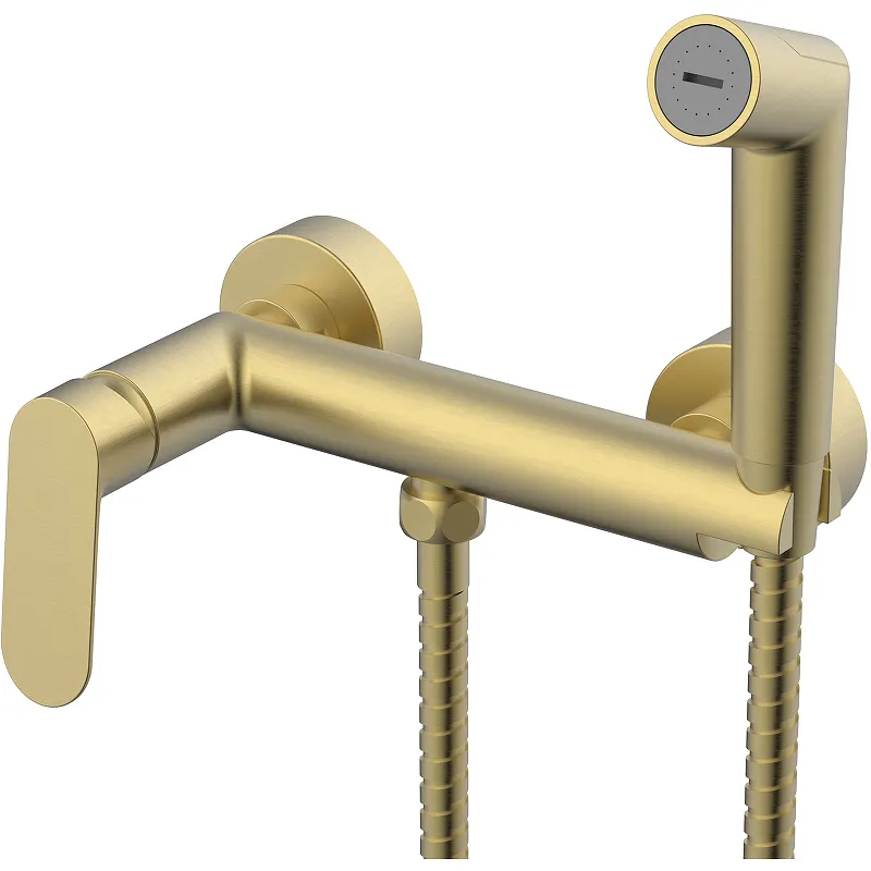 Гигиенический душ со смесителем Splenka S41.51.03 — идеальное решение для ванной комнаты в современном стиле. Этот душ обеспечивает удобство гигиены благодаря однорычажному управлению и стильному дизайну в цвете золото матовое. Простой монтаж на стену делает данный товар отличным выбором для любой ванной комнаты.