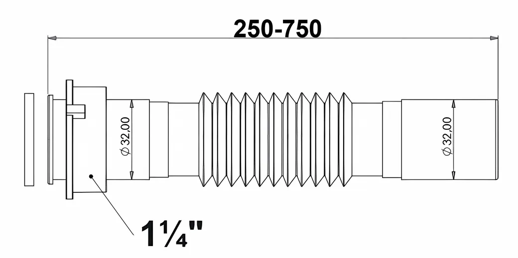 Гофра Bettoserb для раковины/мойки 1 1/4" (32 мм)? Диаметр выпуска: 32 мм? Подключение к канализации: 32 мм? Регулируемая длина: 250–750 мм? Гидрозатвор и фиксатор положения в комплектеИдеальное решение для подключения раковины или мойки к канализации! Гофрированная труба Bettoserb обеспечивает гибкость и удобство монтажа, фиксатор позволяет:? Сформировать гидрозатвор (защита от запахов)? Надежно закрепить соединение в нужном положенииПрочная, долговечная и простая в установке — гофра Bettoserb сделает вашу сантехнику надежной и функциональной!Преимущества: - Быстрая установка - Гарантия качества - Оптимальный размер - Подходит для: моек, раковин, умывальников с выпуском 1 1/4" (32 мм).