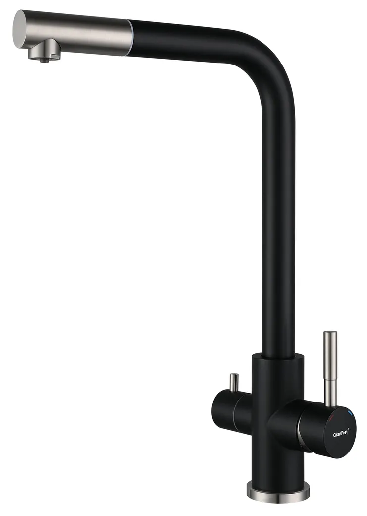 Смеситель для кухни GRANFEST QUARZ с краном для питьевой воды — идеальное решение для современных интерьеров. Черный смеситель с Г-образной формой прекрасно впишется в любой стиль кухни, обеспечивая удобство и функциональность.