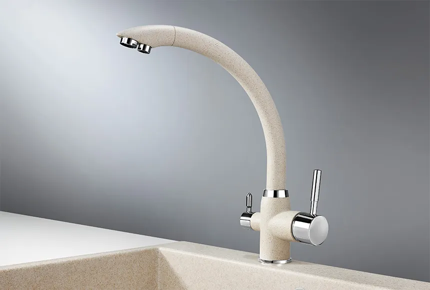 - Эстетичность и стиль: Смеситель окрашен в элегантный цвет пирит, который гармонично впишется в интерьер вашей кухни.