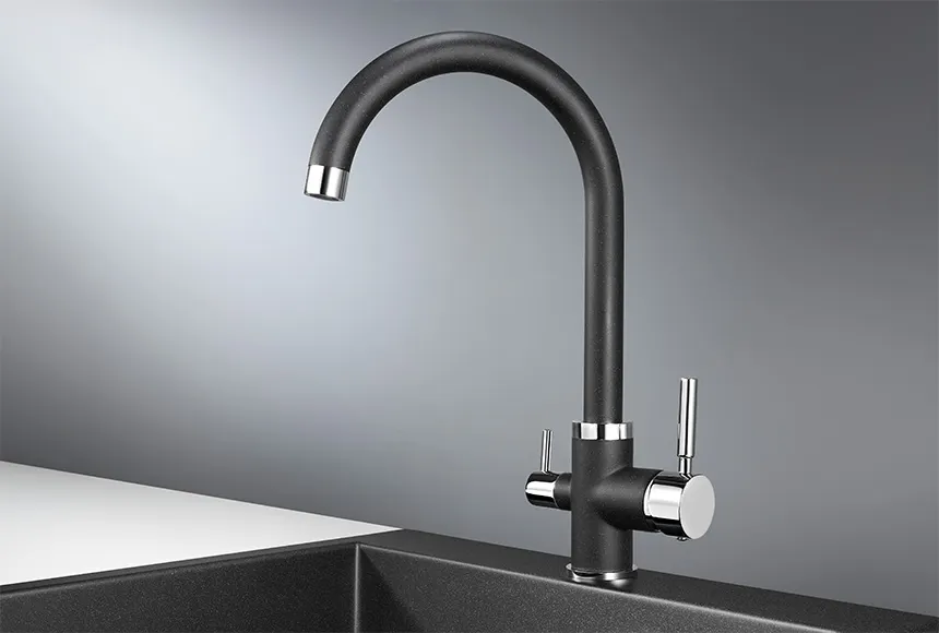 - Эстетичность и стиль: Чёрный цвет смесителя гармонично впишется в любой интерьер кухни, добавляя ей современный вид.