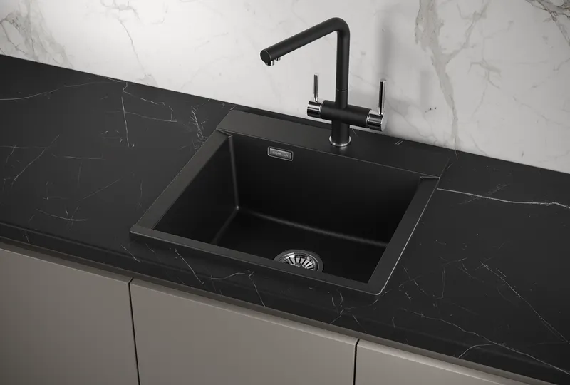 - Мойка из кварца устойчива к царапинам и ударам, что увеличивает срок службы.