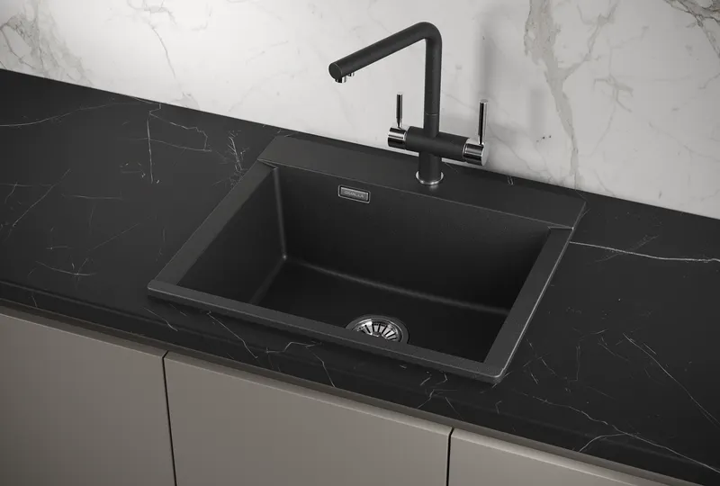 - Универсальность: Чёрный цвет мойки гармонично сочетается с любым кухонным гарнитуром.