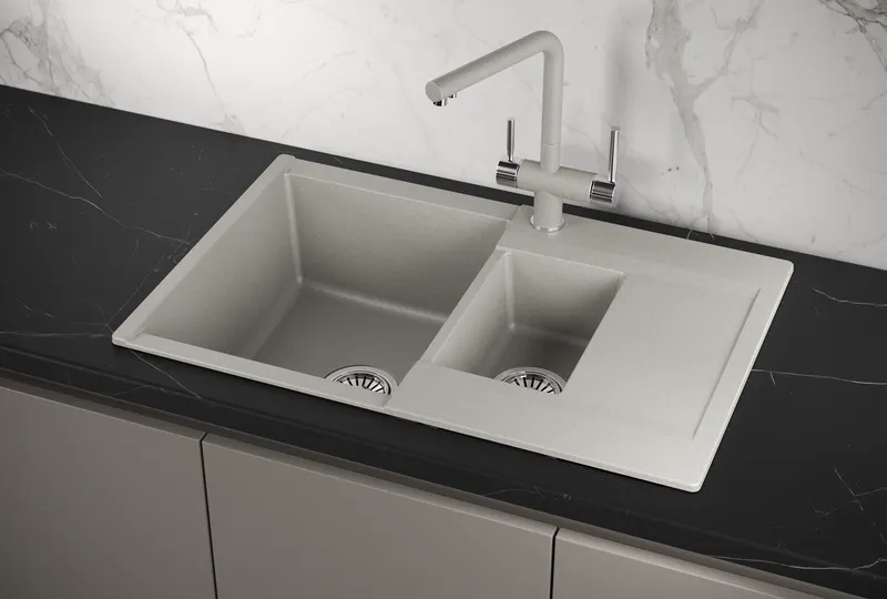 - Прочность материала: Кухонная мойка из кварца устойчива к царапинам и воздействию высоких температур.