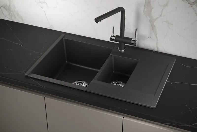- Высокая прочность кварцевой мойки: Кварц обеспечивает устойчивость к царапинам и ударам, что продлевает срок службы мойки.