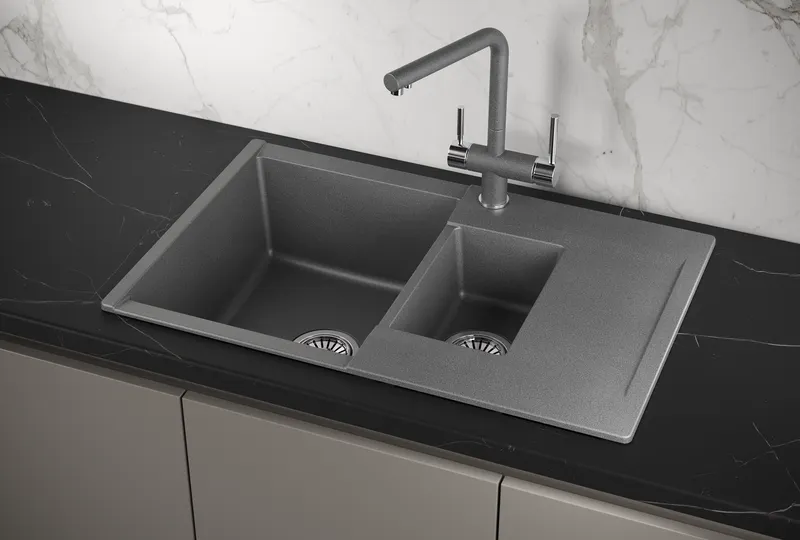 - Кухонная мойка из кварца: Обеспечивает высокую прочность и устойчивость к царапинам, что делает ее долговечной.
