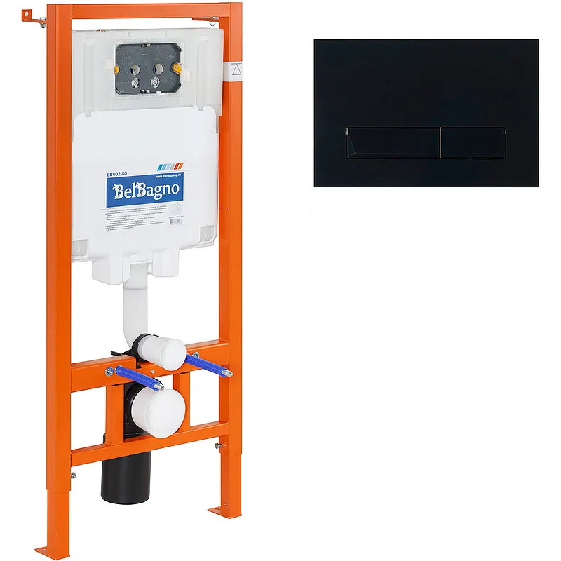 Инсталляция BelBagno BB002-80/BB012-MR-NERO.M с Черной матовой клавишей смыва.Характеристики:Инсталляция: Цвет: оранжевый. Материал: сталь, пластик. Габариты (ШхВхГ): 500х1290х325 мм. Монтажная глубина: 140 мм. Монтажная высота: 1090 мм. Глубина без крепежа: 105 мм. Регулируется по высоте: от 0 до 200 мм. Диаметр трубы от бачка: 45 мм. Диаметр переходника для слива: 90 на 110 мм. Диаметр слива: 90 мм. Объем бачка: 6 л. Заводская настройка слива: 3/6 л. Возможны настройки: 3/4.5 л. Метод крепления: в капитальную стену и пол. Подходит для легких и несущих стен. Подвод воды: сверху бачка. Совместима со всеми видами подвесных унитазов. Рама испытана нагрузкой 400 кг. Фановый отвод для слива, регулируемый по глубине. Межосевое расстояние под крепежные шпильки (для подвесных унитазов): 180 мм. Регулируемое межосевое расстояние под крепежные шпильки: 180/230 мм. Легкость и быстрота установки. Монтаж: в стену. Клавиша смыва: Цвет: черный матовый. Материал: пластик. Размеры (ШхВхГ): 230х150х6.5 мм. Режим слива воды: две кнопки (режим эконом). Управление: механическое. Открывание и закрывание с системой Click. Высокая устойчивость к царапинам. В комплекте поставки: Инсталляция. Крепежные элементы для унитаза. Крепежные элементы для рамы. Комплект соединительных патрубков для унитаза. Фановый отвод для слива. G1/2 запорный клапан. Клавиша смыва.