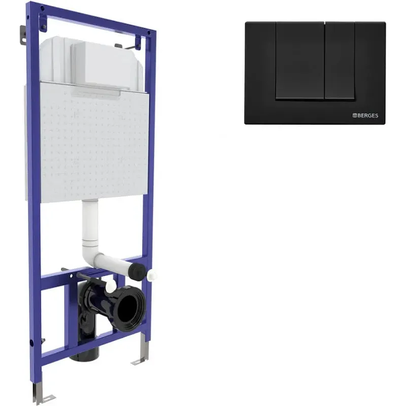 Инсталляция Berges Wasserhaus Novum 040245 для унитаза со смывным бачком и Черной Soft Touch клавишей смыва.Характеристики:Инсталляция: Цвет: синий. Материал: латунь, пластик. Габариты (ШхВхГ): 525х1390х175 мм. Металлический каркас, окрашенный антикоррозийной эмалью. Расчетная нагрузка 400 кг. Толщина бачка 80 мм. Подходит для установки в малогабаритных помещениях. Объём резервуара воды 10 л с тепло- и шумоизоляцией. При давлении 3-5 бар уровень шума от 13 до 18 дБ. Подвод воды сверху (G1/2 наружная). Объем смыва 3/6 литра с возможностью регулировки. Межосевое расстояние под шпильки для подвеса унитаза 180 и 230 мм. Ножки регулировки высоты из оцинкованной стали. Полный комплект для быстрой установки. Клавиша смыва: Цвет: черный. Материал: ABS-пластик. Покрытие: Soft Touch. Габариты (ШхВxГ): 22.5x16.6х1.1 см. Двухрежимная клавиша смыва. Управление: механическое. В комплекте поставки: Инсталляция. Клавиша смыва.