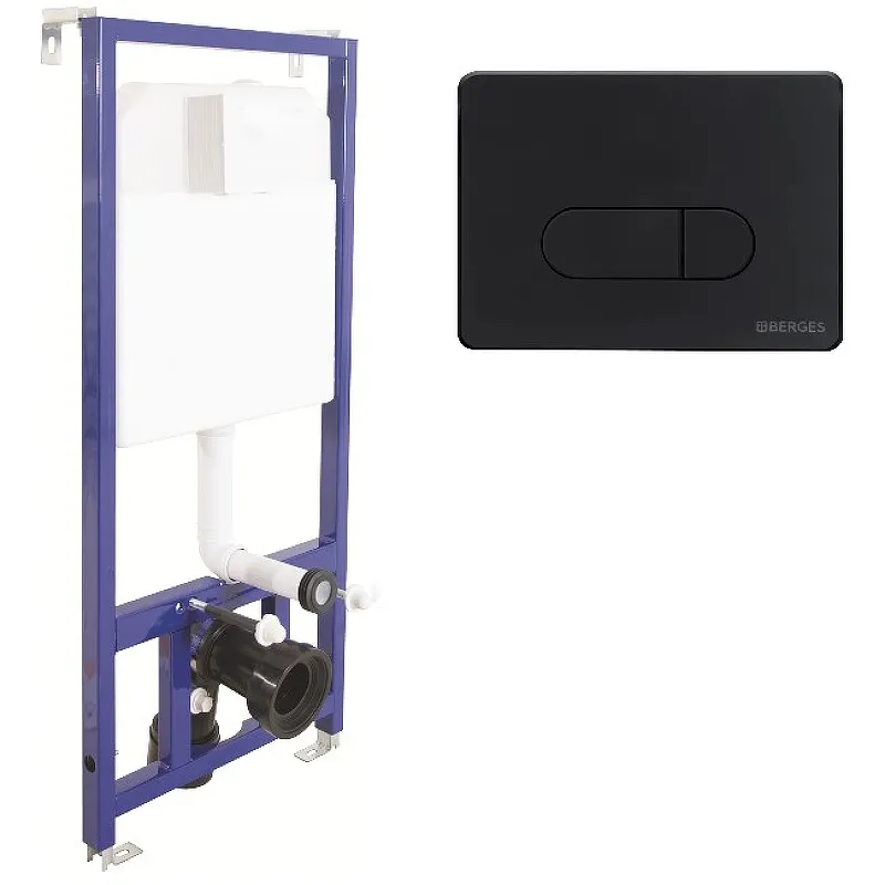 Инсталляция Berges Wasserhaus Novum D5 040235 для унитаза со смывным бачком и клавишей смыва цвета черный.Обеспечивает минимальный уровень шума при смыве воды в туалете или ванной комнате. Полностью готова к установке.Характеристики: Габариты (ШхВхГ): 525х1390х175 мм. Расчетная нагрузка: 400 кг. Межосевое расстояние: 18 и 23 см. Подключение воды: сверху. Объем смыва 3/6 литра с возможностью регулировки. Уровень шума при давлении 3 бар не превышает 13 дБ. Управление механическое, две кнопки. В комплекте поставки: Инсталляция. Смывной бачок. Кнопка смыва. Полный комплект установки.