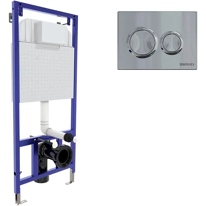 Инсталляция Berges Novum L3 040263 для унитаза с клавишей смыва Хром глянцевый.Характеристики:Инсталляция: Цвет: синий. Материал: латунь, пластик. Габариты (ШхВхГ): 525х1390х175 мм. Металлический каркас, окрашенный антикоррозийной эмалью. Расчетная нагрузка 400 кг. Толщина бачка 80 мм. Подходит для установки в малогабаритных помещениях. Объём резервуара воды 10 л с тепло- и шумоизоляцией. При давлении 3-5 бар уровень шума от 13 до 18 дБ. Подвод воды сверху (G1/2 наружная). Объем смыва 3/6 литра с возможностью регулировки. Межосевое расстояние под шпильки для подвеса унитаза 180 и 230 мм. Ножки регулировки высоты из оцинкованной стали. Полный комплект для быстрой установки. Клавиша смыва: Цвет: хром глянцевый. Материал: пластик. Размеры (ШхВхГ): 225х165х11 мм. Режим слива воды: две кнопки (режим эконом). Управление: механическое. В комплекте поставки: Инсталляция. Клавиша смыва.