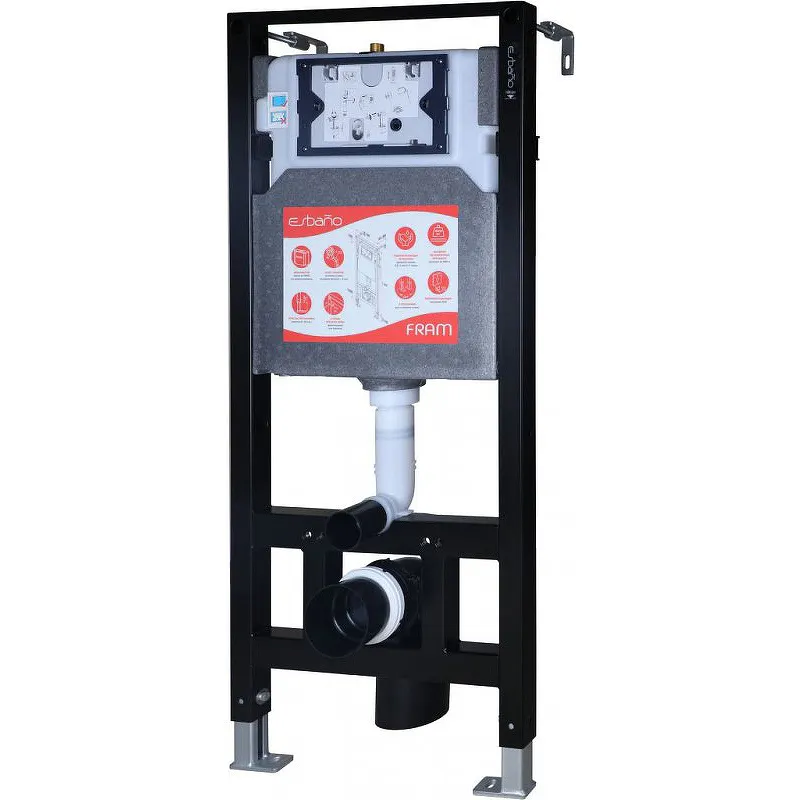 Инсталляция Esbano Fram ESINFRAM.Характеристики: Цвет рамы: черный. Материал рамы: сталь. Толщина металла 2 мм, в местах навески унитаза увеличена до 3,5 мм. Рама с качественной порошковой окраской. Цельнолитой бачок из HDPE (со звукоизоляцией). Заводская установка смыва: экономный 4,0 л / полный 6,0 л. Удобная конструкция клапана слива с большим диапазоном регулировки. 2 опции крепежа рамы фронтальный или боковой. 4 положения для установки ножек. Простая регулировка высоты (0-20 см). Звукопоглощающая прокладка EVA. Высокая механическая прочность - нагрузка до 400 кг. Габариты (ШхВхГ): 506х1114х170-200 мм. Монтаж: в стену. В комплекте поставки: Рама с бачком. Прокладка звукопоглащающая. Колено сливное. Трубка впускная. Труба выпускная. Манжета. Комплект креплений.