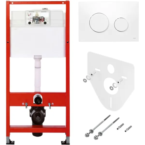 Инсталляция для подвесного унитаза Tece Profil K440920 (K400600) со смывным бачком скрытого монтажа в комплекте с креплением для монтажной рамы, со звукоизоляционной пластиной, с пластиковой кнопкой смыва белого цвета. Прочная стальная рама.Характеристики: Монтажная рама: Материал: сталь. Максимальная нагрузка: 400 кг. Высота: 112 см. Регулировка высоты: 20 см. Установочное расстояние для унитаза: 18 или 23 см. Прокладка звукоизолирующая: 21,6x0,6x14,5 см. Бачок: Общий объем: 10 л. Диапазон настройки большого объема смыва: 4,5/6/7,5/9 л. Объем малого смыва: 3 л. Расположение панели смыва: фронтальное. Клавиша смыва: Цвет: белый. Материал: пластик. Система смыва: двойная. Управление: механическое. Размеры (ШхДхВ): 21,6x0,6x14,5 см. В комплекте поставки: Инсталляция 9400001. Крепления для монтажной рамы 9380007. Прокладка звукоизолирующая 9200010. Клавиша смыва Loop Plastic 9240600.