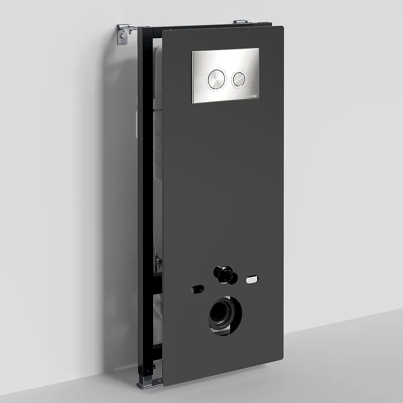 - Элегантный дизайн: Черное стекло и никелированная клавиша смыва добавляют изысканности в интерьер ванной комнаты.