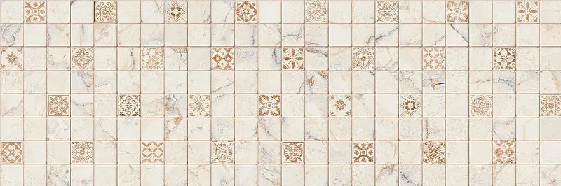 Керамическая плитка Primavera Elise Beige Decor 08 NG DNG07-08, настенная, размером 30x90 см из Индии, станет идеальным решением для оформления интерьера. Бежевый цвет плитки с рисунком под мрамор и имитацией мозаики прекрасно подойдет для гостиной, ванной комнаты, кухни и коридора. Матовая поверхность добавляет изысканности и современного стиля в любое помещение.