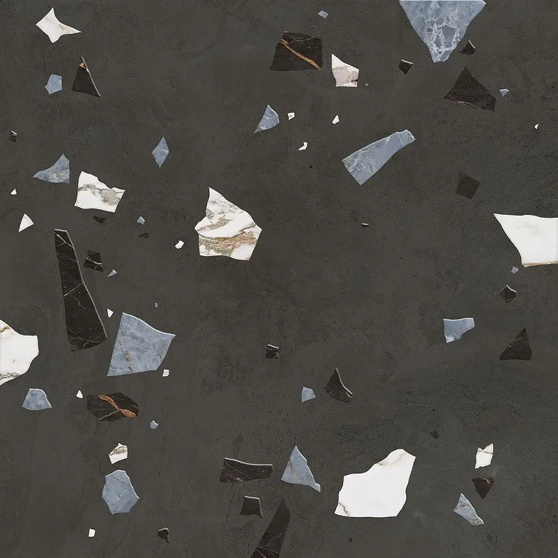 - Стильный дизайн: Темно-серый цвет и рисунок тераццо делают этот керамогранит идеальным для интерьеров в стиле лофт.