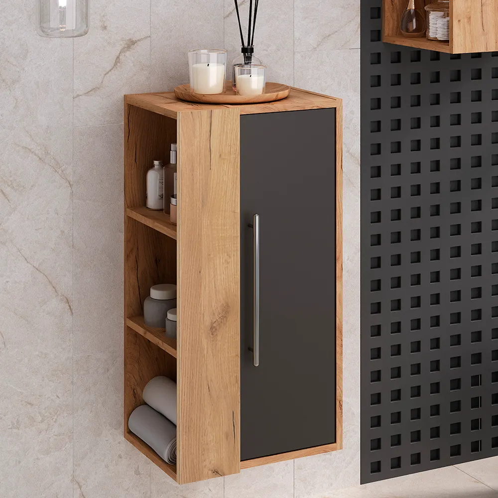 Коллекцию мебели для ванных MELBOURNE отличает оригинальность, функциональность и минимализм. Характерные особенности серии: простые строгие линии, отсутствие лишних элементов и хромированная рейлинговая ручка, которая эффектно подчеркивает элегантность и лаконичность каждой детали. Модели сочетают в себе две текстуры: корпус выполнен из влагостойкого ЛДСП "Дуб Крафт золотой", выгодно подчеркнутым фасадами из МДФ в серой матовой пленке. Коллекция выпускается в четырех размерах: 40,60,80 и 100см. Комод MELBOURNE 40см /дуб/белый/ подвесной с двумя открытыми полками снаружи и с закрытым отделением. За распашной двекой - две встроенные полки. Модель дополняет комплект в качестве еще одного места для хранения банных принадлежностей. Комод можно использовать и в качестве навесного шкафа, и как полупенал, в зависимости от высоты монтажа. А если повесить два изделия друг над другом, то получится полноценный шкаф-пенал. Комод универсальный (для смены ориентации изделие поворачивается на 180 градусов).