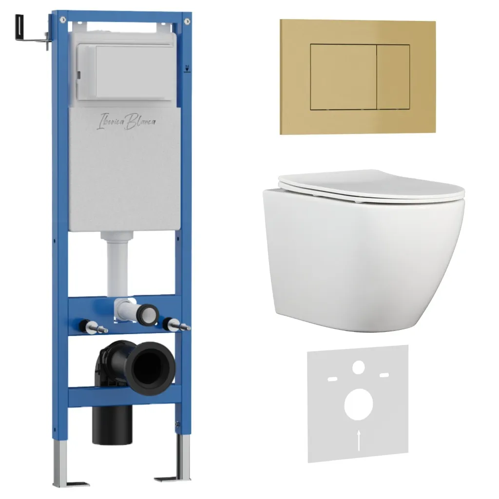 Комплект 3в1 IBERICA BLANCA инсталляция SILENCIO MINI, унитаз BILBAO ALTO белый, кнопка смыва ESTI-S золото матовое арт-IB.001M.BLA.231.854