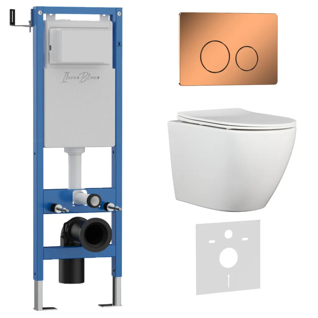 Комплект 3в1 IBERICA BLANCA инсталляция SILENCIO MINI, унитаз BILBAO ALTO белый, кнопка смыва INOX-О розовое золото глянцевое арт-IB.001M.BLA.231.8171
