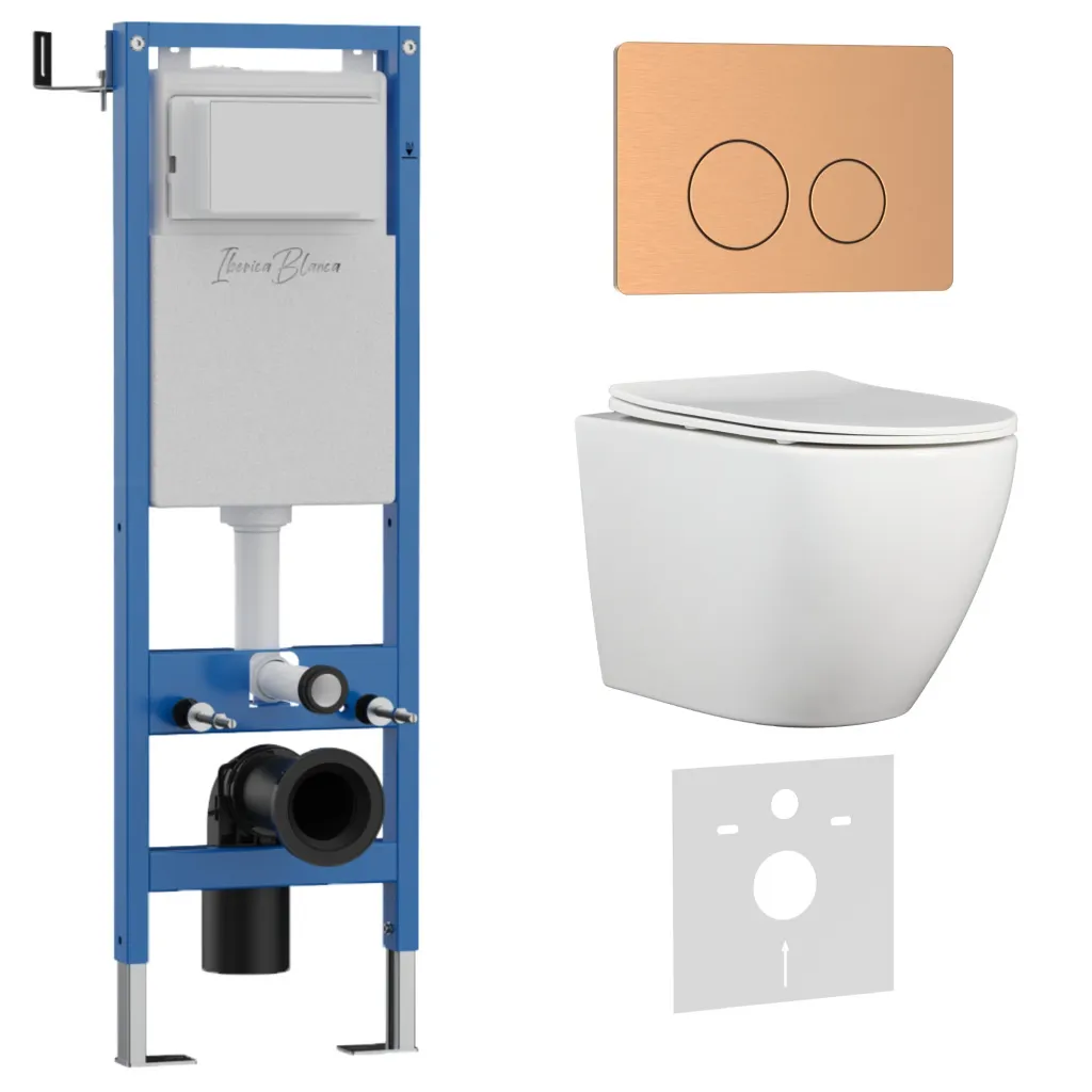Комплект 3в1 IBERICA BLANCA инсталляция SILENCIO MINI, унитаз BILBAO ALTO белый, кнопка смыва INOX-О розовое золото матовое арт-IB.001M.BLA.234.8172