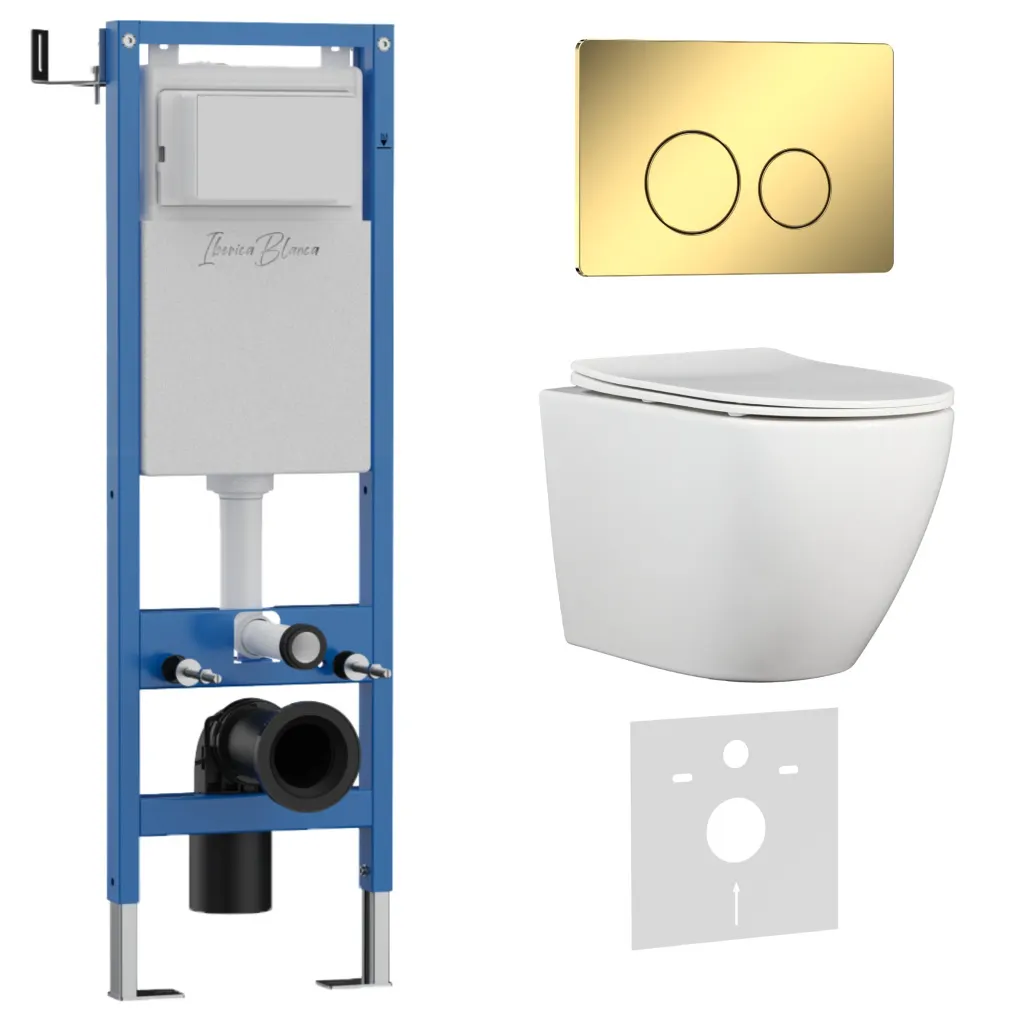Комплект 3в1 IBERICA BLANCA инсталляция SILENCIO MINI, унитаз BILBAO ALTO белый, кнопка смыва INOX-O золото глянцевое арт-IB.001M.BLA.231.816