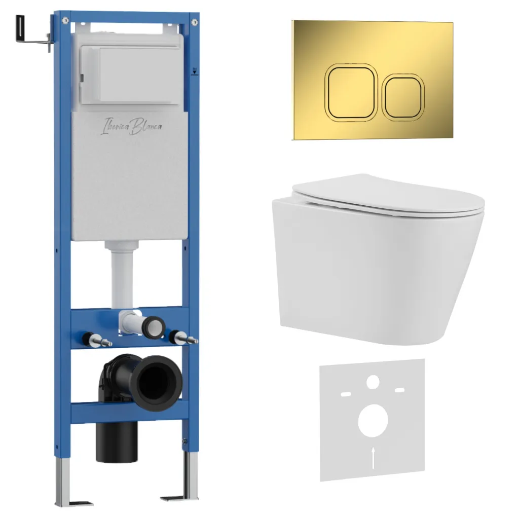 Комплект 3в1 IBERICA BLANCA инсталляция SILENCIO MINI, унитаз BURGOS ALTO белый, кнопка смыва ESTI-Q золото глянцевое арт-IB.001M.BRA.234.836