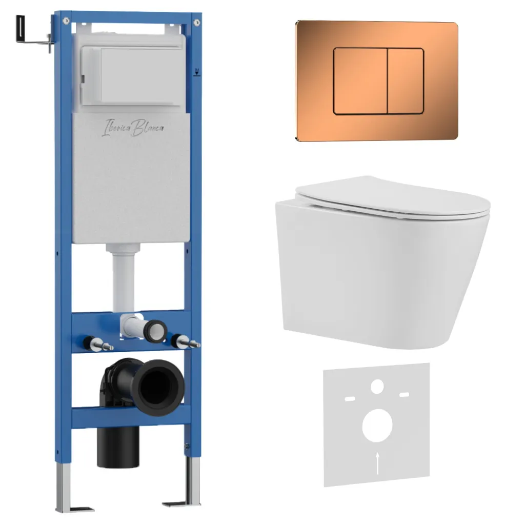 Комплект 3в1 IBERICA BLANCA инсталляция SILENCIO MINI, унитаз BURGOS ALTO белый, кнопка смыва INOX-C розовое золото глянцевое арт-IB.001M.BRA.234.1141