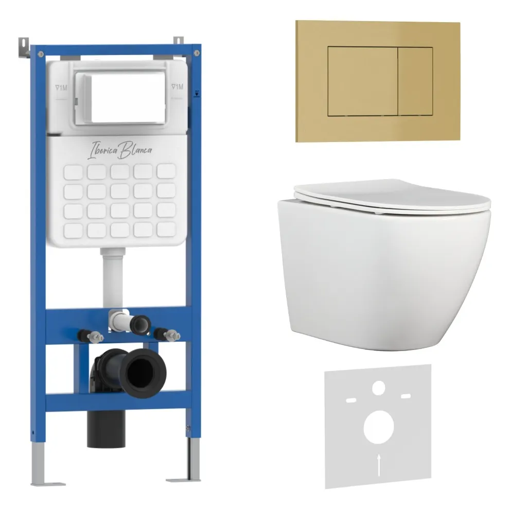 Комплект 3в1 IBERICA BLANCA инсталляция SILENCIO, унитаз BILBAO ALTO белый, кнопка смыва ESTI-S золото матовое арт-IB001.BLA.231.854