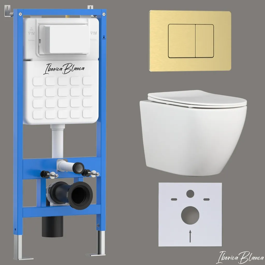 Комплект 3в1 IBERICA BLANCA инсталляция SILENCIO, унитаз BILBAO ALTO белый, кнопка смыва INOX-C золото матовое арт-IB001.BLA.231.1150