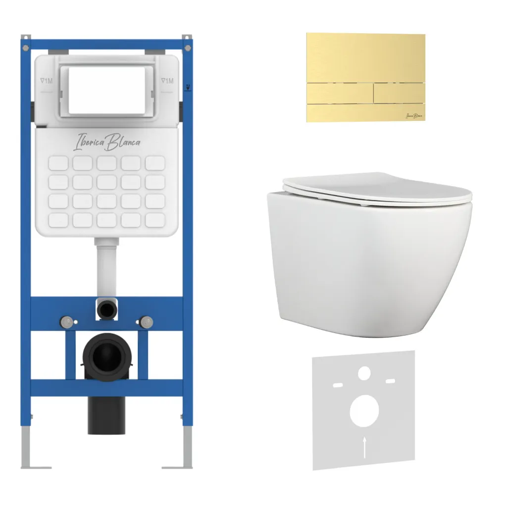 Комплект 3в1 IBERICA BLANCA инсталляция SILENCIO, унитаз BILBAO ALTO белый, кнопка смыва INOX-S золото матовое арт-IB001.BLA.234.1603