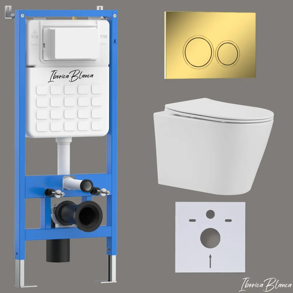 Комплект 3в1 IBERICA BLANCA инсталляция SILENCIO, унитаз BURGOS ALTO белый, кнопка смыва ESTI-O золото глянцевое арт-IB001.BRA.231.826