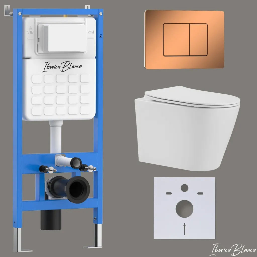 Комплект 3в1 IBERICA BLANCA инсталляция SILENCIO, унитаз BURGOS ALTO белый, кнопка смыва INOX-C розовое золото глянцевое арт-IB001.BRA.234.1141
