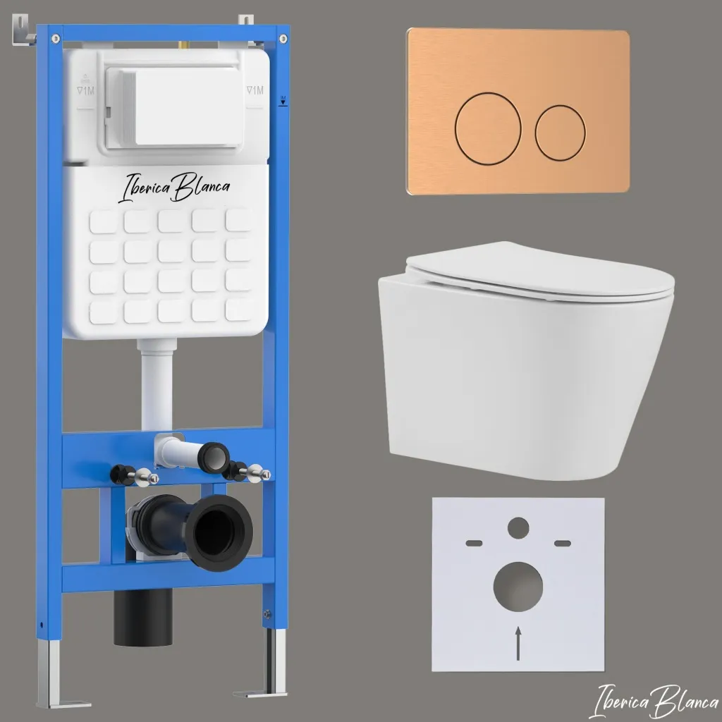 Комплект 3в1 IBERICA BLANCA инсталляция SILENCIO, унитаз BURGOS ALTO белый, кнопка смыва INOX-О розовое золото матовое арт-IB001.BRA.231.8172