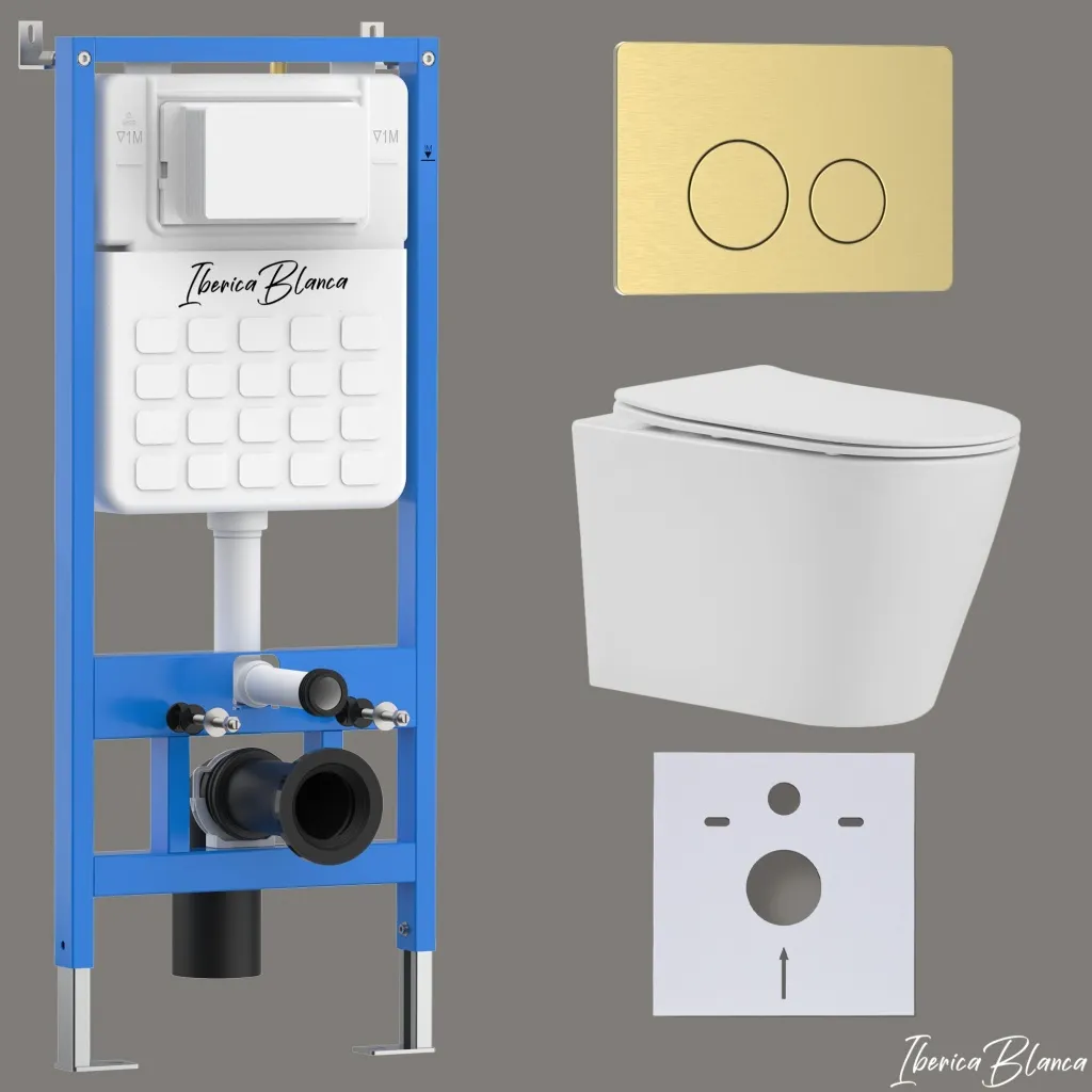 Комплект 3в1 IBERICA BLANCA инсталляция SILENCIO, унитаз BURGOS ALTO белый, кнопка смыва INOX-O золото матовое арт-IB001.BRA.231.815