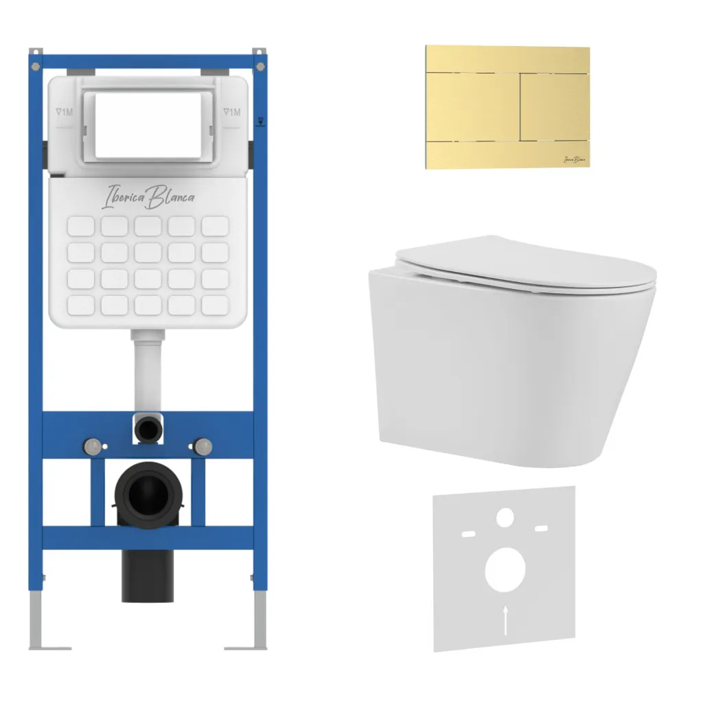 Комплект 3в1 IBERICA BLANCA инсталляция SILENCIO, унитаз BURGOS ALTO белый, кнопка смыва INOX-R золото матовое арт-IB001.BRA.234.1503