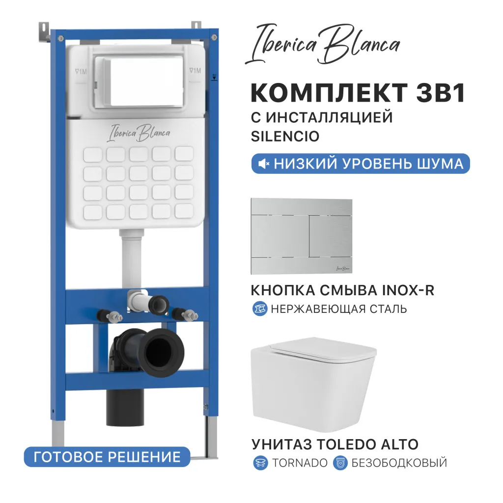 Комплект 3в1 IBERICA BLANCA инсталляция SILENCIO, унитаз TOLEDO ALTO белый, кнопка смыва INOX-R хром матовый арт-IB001.TLA.234.1501