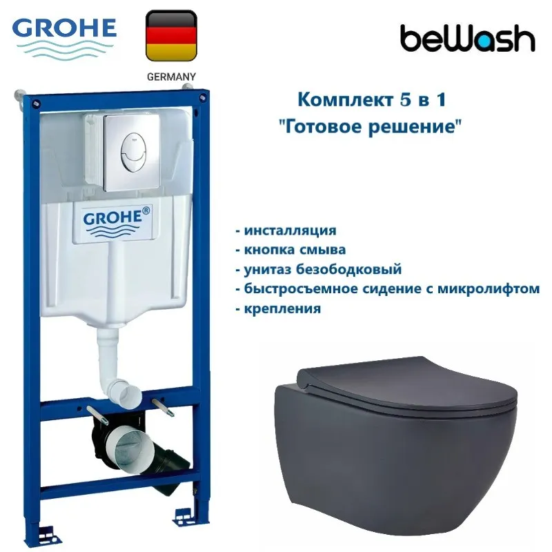 КОМПЛЕКТ Grohe + BeWash: Инсталляция 38721001 Grohe Rapid SL + BeWash Bogen Унитаз подвесной безободковый с сиденьем микролифт антрацит 88303280 арт-GRH721303280