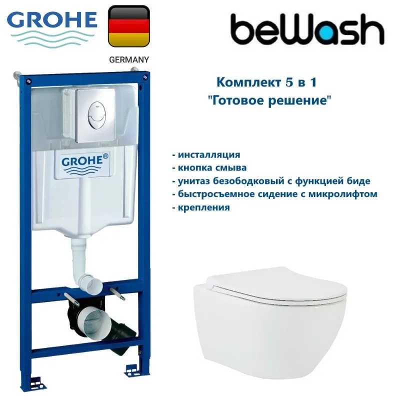 Комплект для монтажа подвесного унитаза: инсталляция Grohe, 38721001 Rapid SL : стальная рама с порошковым напылением, смывной бачок (резервуар воды объемом 9 литров, объем смыва 3/6 литра), нагрузка 400 кг, кнопка Skate Air хром. Гарантия 10 лет; унитаз beWash Bogen, подвесной безободковый с функцией биде белый глянец 88303601+EVB6388: сиденье дюропласт: микролифт, быстросъемное. Все крепежи для установки в комплекте. Гарантия 10 лет.